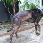 Benji came to us via Mayan Families in Panajachel. He was spotted on the stret by Angela Padilla of Northern California Family Dog Rescue, and she asked to have him sent to her rescue in adoption. Benji was in terrible condition, with bald, scabby shin, severely underweight, and riddled with parasites. He needed several months of good care to be healthy enough to fly to the US.