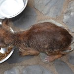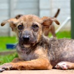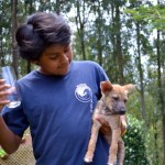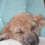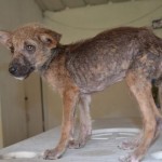 Puppy Kali was in terrible shape when we brought her in. Kali was almost hairless, scabby and infested with fleas and mange, bloated with parasites, weak and terrified, but she was too hungry to be able to resist bits of meat tossed to her. We managed to catch her and brought her home, hoping that we had gotten her in time to treat her myriad health issues.