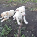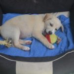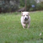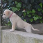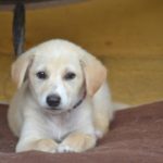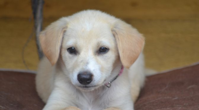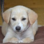 Charlotte is a gorgeous creamy yellow puppy with white markings. She had an injury to her front foot that left it without hair. She is sweet, friendly and very playful. She is doing really well in her training, and follows right along when off leash, walks nicely on leash, and has a lured sit, down, and hand target. She is now weaned, and already has a family interested in adopting her.