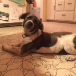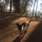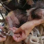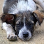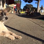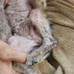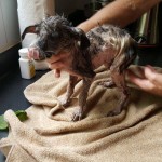 Domino was huddled by the side of the road in terrible shape. We spotted him from the car as we passed, and stopped to see if we could catch him. He was mostly hairless, suffering from mange and a flea bite allergy, and his little belly was terribly distended with parasites. He was terrified, and immediately ran to escape, but in his fright he was looking back toward us and he ran into a thick bush where he became entangled and couldn’t escape quickly enough.