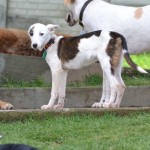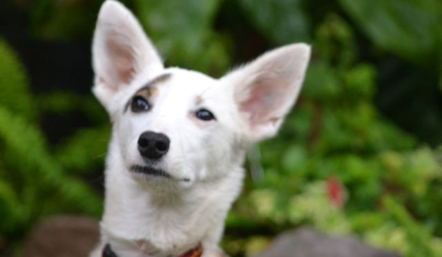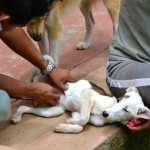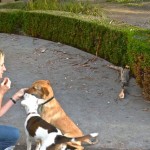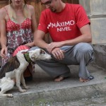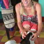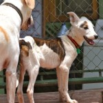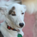 We spotted Lila (pronounced Lee-la, meaning Lilac in French…and Spanish) ) wandering near the central park in Antigua on August 15, 2013. She stood out because of her beautiful and unique markings (white with a dark brown saddle and eye patch) and because she was filthy and pathetically, skeletally thin. Her tail was plastered against her belly, her hip bones threatened to pop out through her skin, and she was trying her best to be invisible as she scrounged for food. We tried to attract her, but she was spooked by a very noisy parade, and disappeared. Disappointed that we couldn’t find her, we carried on, hoping that we would see her again and have better luck.