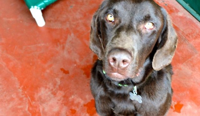 Moose is a young (1 -1 1/2 year old) chocolate lab. He was a working dog, apparently sniffing termites for his owner who ran a pest control company.