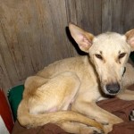 When we first saw her in late December of 2011 Suzanna was a skeletally thin blonde German Shepherd mix who was desperately scrounging for anything edible. She had recently given birth, though there was no sign of her babies. She was literally skin, bones, and swollen teats. Here ears appeared completely outsized for the size of her bony head and starved body. We estimated that she was a couple of years old when we found her, possibly three.